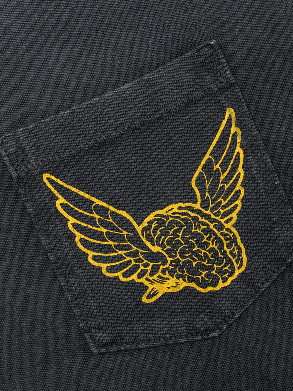 The Flying Brain Pocket Tee in Vintage Black merges contemporary design with artistic flair. Cut from 100% cotton in a boxy, cropped silhouette, it delivers a relaxed yet intentional fit suited to modern wardrobes. The signature flying brain graphic positioned over the front pocket serves as a bold statement piece, whilst modernized wash treatments create an authentically worn aesthetic. Ideal for layering or standalone wear, this tee bridges casual comfort with distinctive edge—a versatile essential for those seeking character in their everyday pieces.
