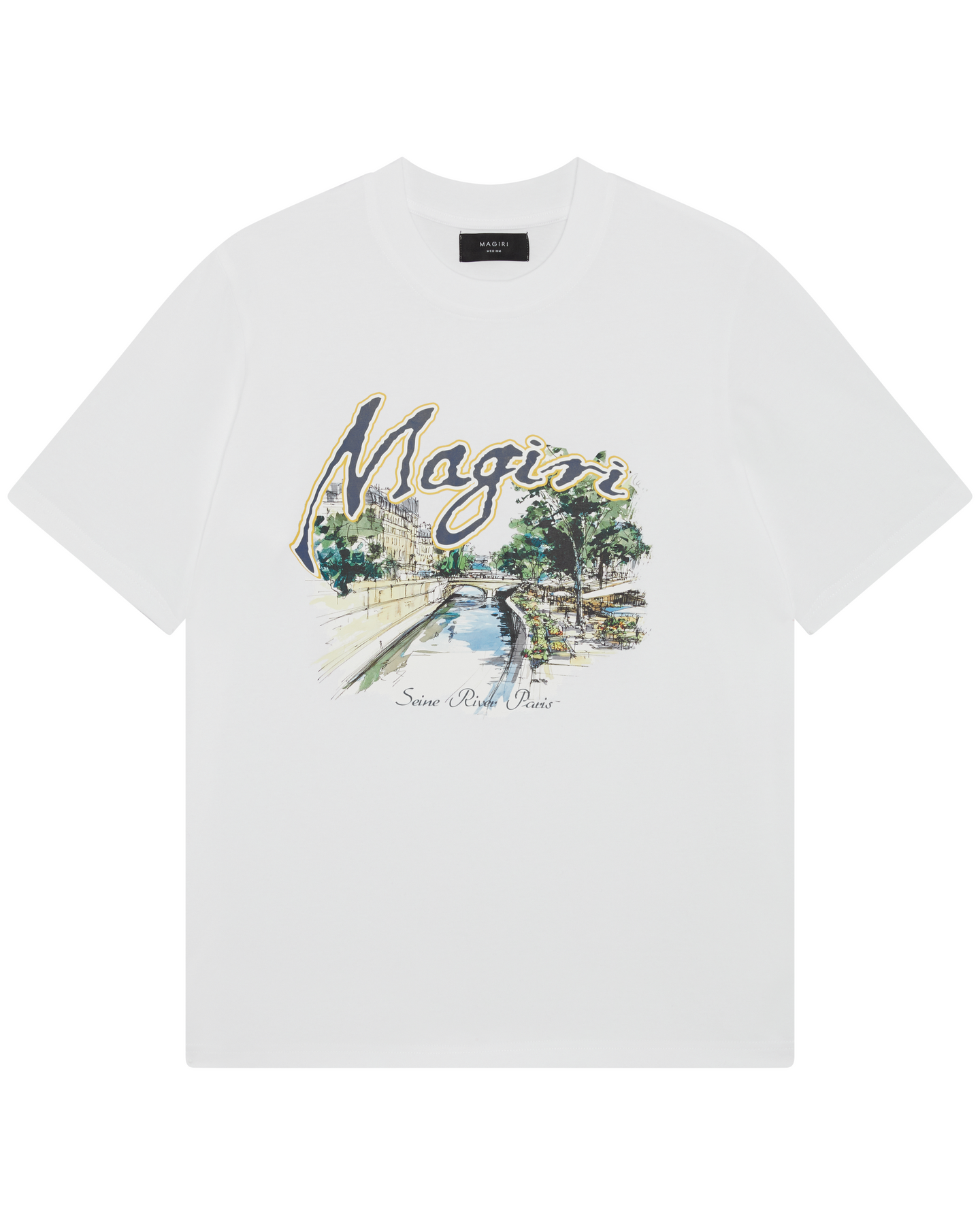 The MAGIRI Seine T-Shirt pays tribute to Parisian romance and quiet sophistication. Featuring a detailed scenic print and classic silhouette, it is crafted from 100% premium cotton for enduring comfort and structure. A refined staple that embodies the city’s poetic rhythm through understated design.