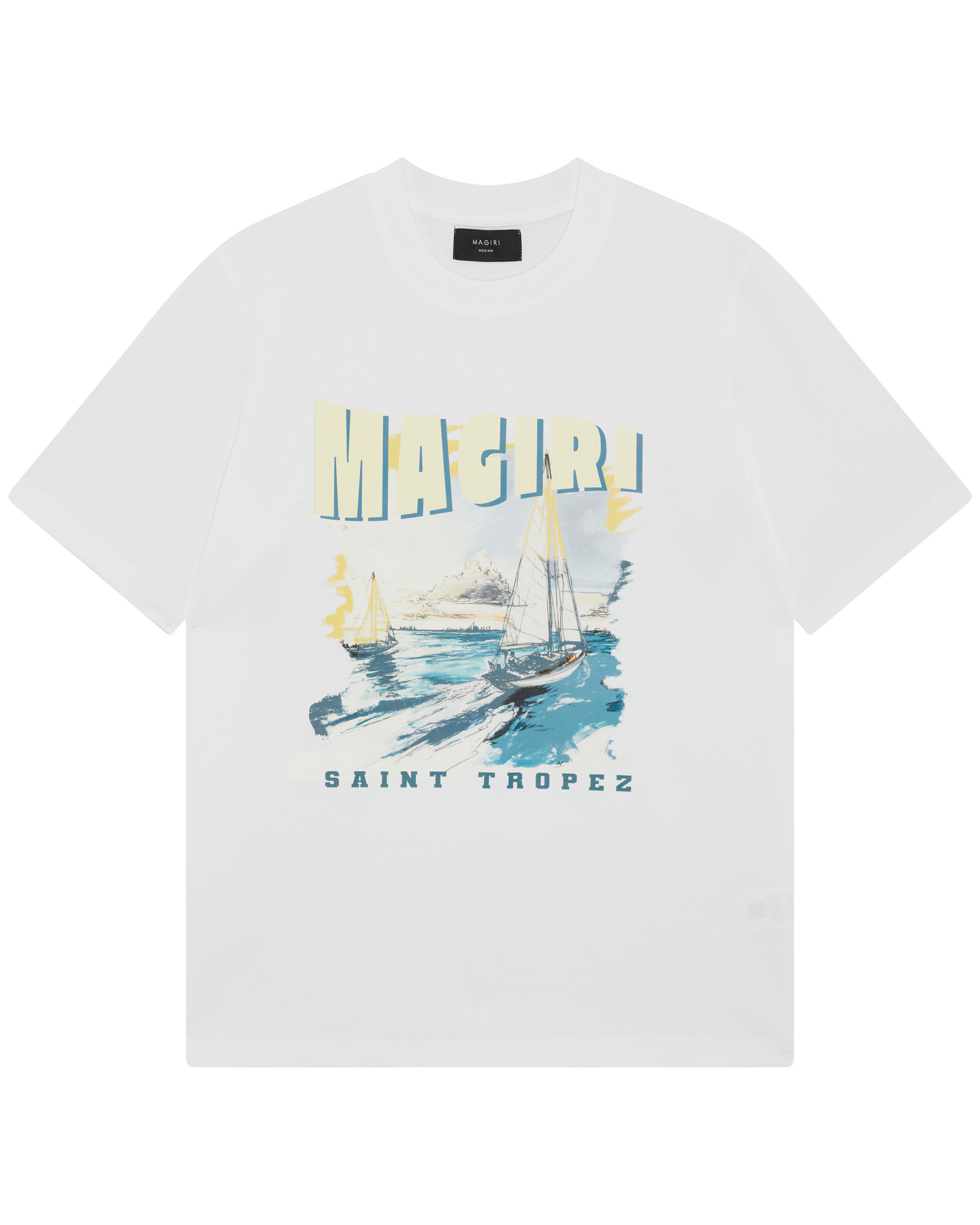 The MAGIRI Voyage T-Shirt channels the freedom of the open sea with a dynamic sailing illustration that embodies movement and exploration. Crafted from 100% luxury cotton, this piece offers a luxurious drape and timeless silhouette. A statement of effortless confidence and coastal refinement.