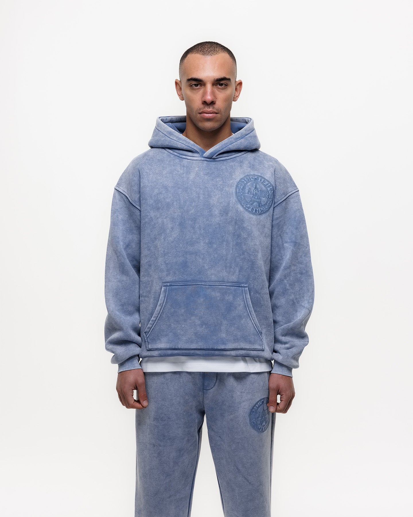 The Blue Acid Washed Hoodie has been crafted from premium heavyweight cotton in a classic hoodie silhouette. Featuring a unique acid wash finish, each piece carries subtle variations for a distinctive look. Finished with a soft velvet lining, embroidered front patch and a large embroidered patch at the rear.