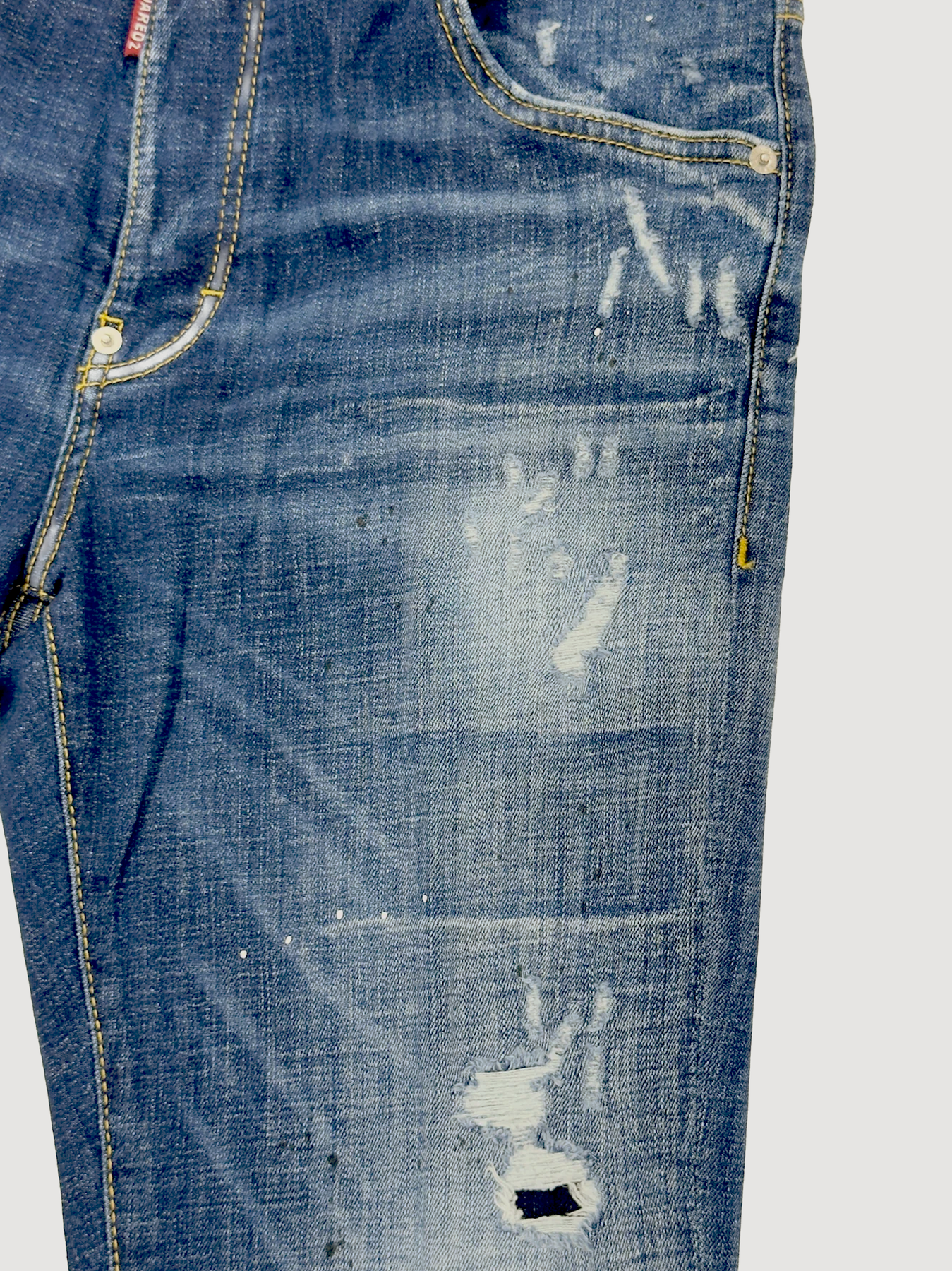 Embrace the bold and rebellious aesthetic of Dsquared2 with the Skater Skinny Jeans. This style is expertly crafted in Italy, offering a contemporary skinny fit that remains comfortable and flexible, thanks to the quality stretch denim. Presented in a vibrant blue wash, these jeans capture attention with their highly distressed finish, featuring authentic rips and tears that lend them a perfectly worn-in edge. The look is completed with signature Dsquared2 flair: striking black and white paint splatters applied throughout, and an unmissable orange Dsquared2 logo patch proudly stitched onto the rear waistband. Perfect for those seeking high-impact, street-ready style.
